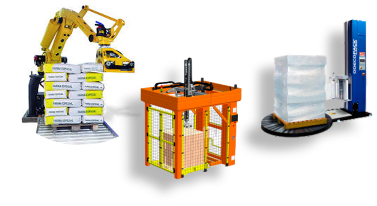 Paletizadores tradicionales mecánicos por capa, robots cartesianos y robots antropomórficos de varias marcas. Sistemas Integrados con envolvedoras de Pallets y dependiendo de cada caso en particular se ofrece la solución más adecuada para cada proyecto.
